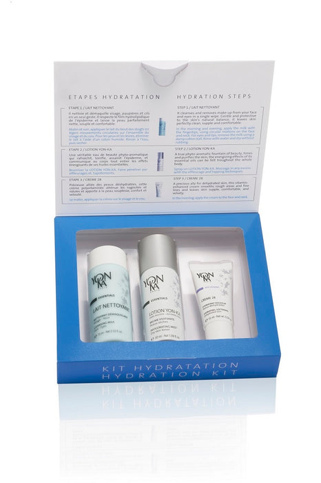 Set includes LAIT NETTOYANT (2.53 oz), LOTION PS (1.69 oz), CREME 28 (.54 oz) Your Yon-Ka expert home regimen : 3 quick & easy "must-do" to ensure immediate suppleness, comfort and a softer skin touch to the driest skins. STEP 1 / LAIT NETTOYANT It cleanses and removes make-up from your face and eyes in a single wipe. Gentle and protective to the skin's natural balance, it leaves skin perfectly clean, supple and comfortable. In the morning and evening, apply the milk with the fingertips, using circular motions on the face and neck. For eyes and lips, remove the milk using a damp cotton ball. Rinse with water and dry without rubbing. STEP 2 / LOTION YON-KA A true phyto-aromatic fountain of beauty, tones and purifies the skin, the energizing effects of its essential oils can be felt troughout the whole body. Spray on LOTION YON-KA. Massage in any excess with the effleurage and tapping techniques. STEP 3 / CREME 28 A precious ally for dehydrated skin, this vitamin-enhanced cream smooths rough areas and fine lines and leaves skin supple, comfortable, and velvety. In the morning, apply the cream to the face and neck.