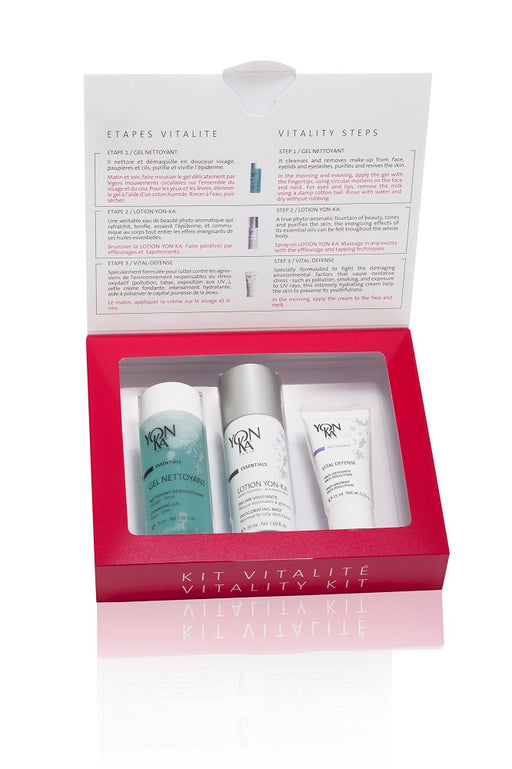 Set includes GEL NETTOYANT (2.53 oz), LOTION PG (1.69 oz), VITAL DEFENSE (.53 oz) Your Yon-Ka expert home regimen : 3 quick & easy "must-do" to...