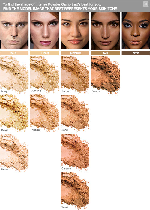 Medium to full coverage powder foundation. "SWEAT IN PUBLIC. WALK IN THE RAIN. WE'VE GOT YOU COVERED. Medium to full coverage powder foundation Formulated with CAMO PIGMENTS®, Intense Powder Camo contains a uniquely high level of pigments in a plush powder. Completely customizable, Intense Powder Camo is buildable, blendable and unstoppable. Glides on evenly for shine-proof, doubt-proof, all-day confidence. Never cakey or masky. Effectively camouflages: Redness, Uneven Skintone, Acne and Birthmarks Dermatologist tested. Allergy tested. Non-comedogenic. Non-acnegenic. Fragrance free. Sensitive skin tested." Application Techniques: "1. Customize your coverage: Medium coverage: apply with powder brush Maximum coverage: apply with sponge 2. Layer to desired coverage level. 3. Customize your finish: Matte finish: apply dry and leave dry. Dewier finish: apply dry onto skin, then use a damp sponge and gently pat over covered areas"
